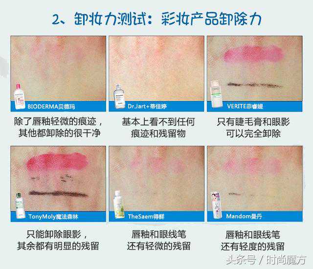 分别将唇釉、睫毛膏、眼线笔、眼影分别涂抹在手上,然后使用沾满卸妆水的化妆棉轻轻擦拭,以测试卸妆水对不同彩妆产品的写出强度。
