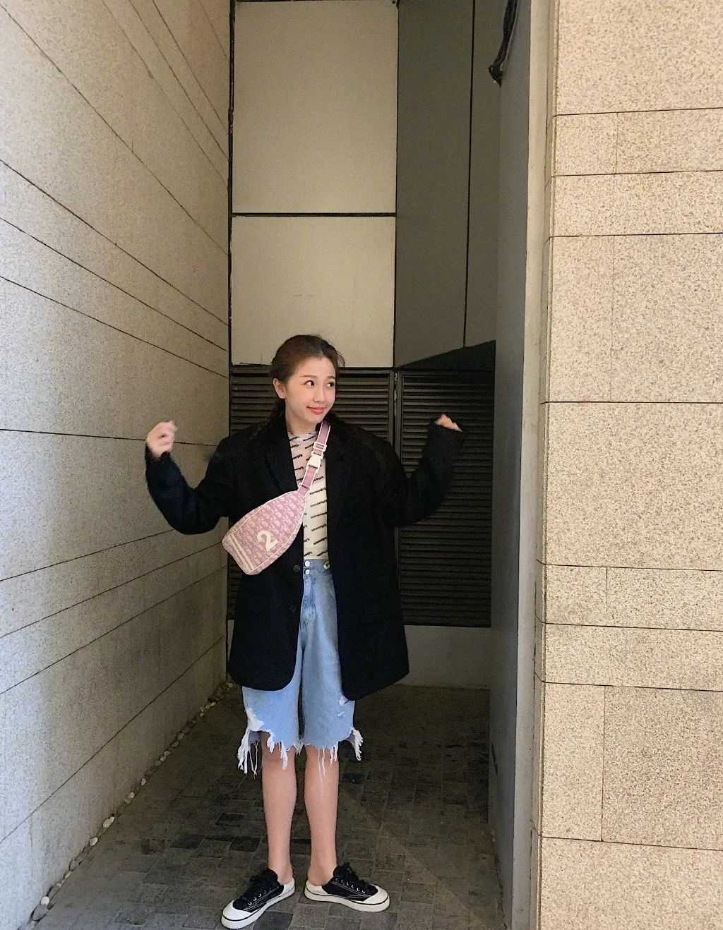 西装外套搭配百慕大牛仔短裤及条纹内搭