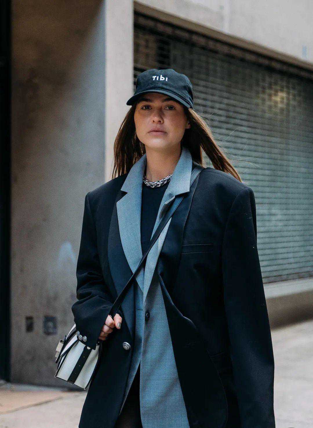 选择与西装同色系的棒球帽,