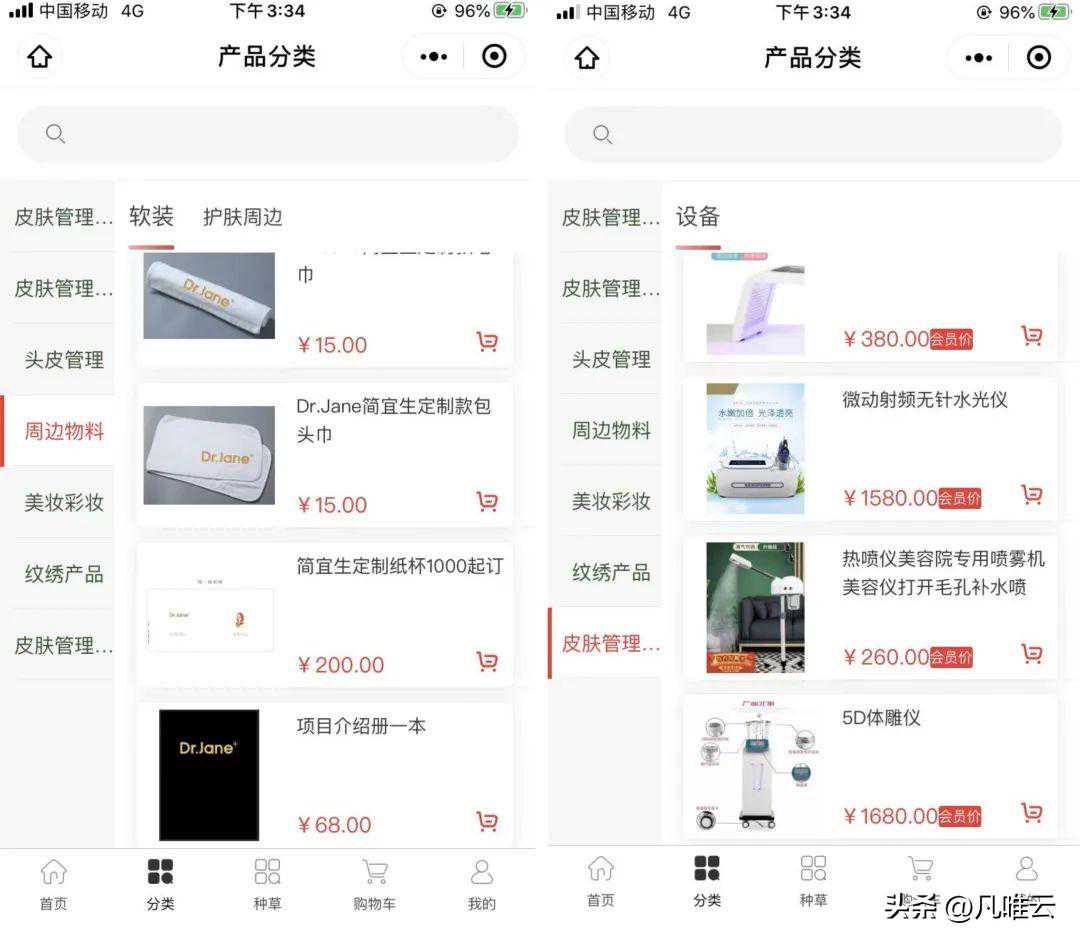 小程序商城的搭建,让产品得以快速上线展示。运营人员按照产品的适用项目、功能性进行分类。如:皮肤管理、头皮管理、美妆彩妆、周边物料等。