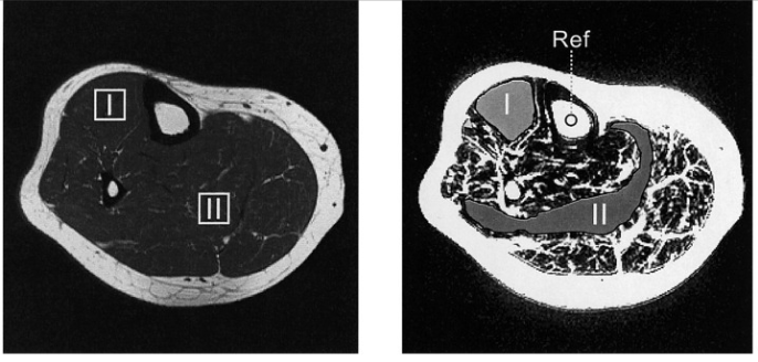 ▲人小腿的比目鱼肌和胫骨前肌的典型区域的MRI扫描结果图,其中白色为脂质