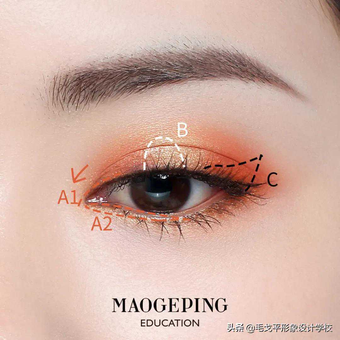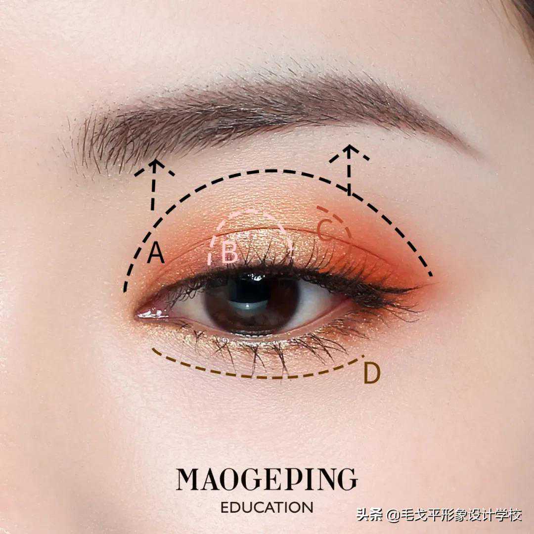 A区浅色打底,首尾两端(B)加深,眼皮中间(C)提亮,放大双眼的效果比较好~