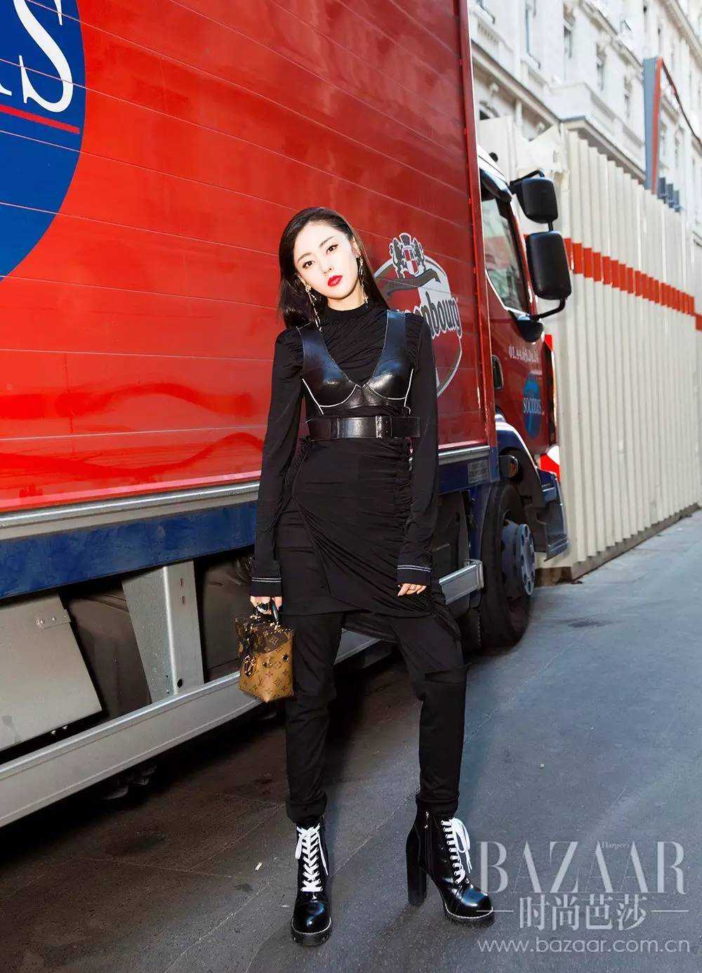 首先请看张天爱的及踝靴搭配示范,长款黑色上衣搭配修身裤,整个造型遮盖了亚洲女生身材矮小的问题,一双高跟及踝靴提升了比例,穿出了超模风范。