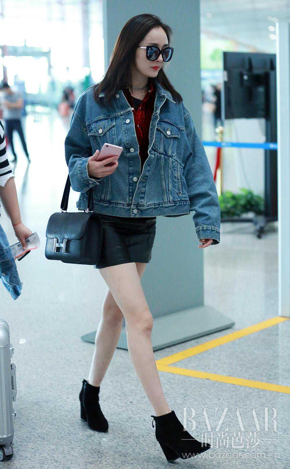 再来看大幂幂,牛仔夹克配皮革短裙,这样穿及踝靴可以很好地展露出腿部的完美线条,芭姐给造型满分哦~