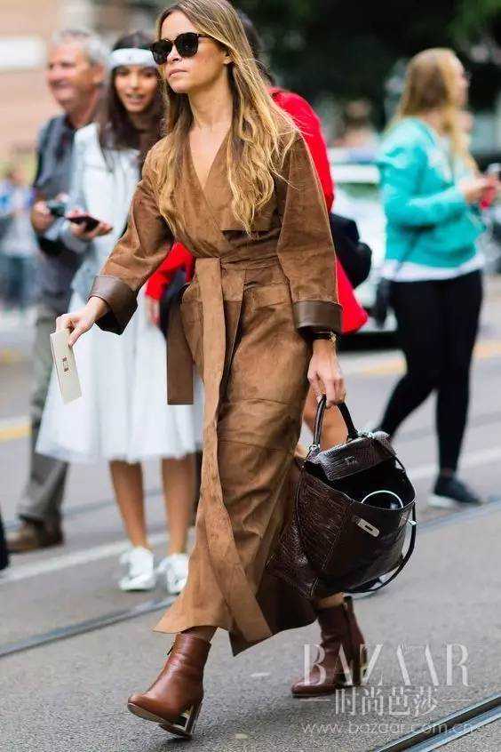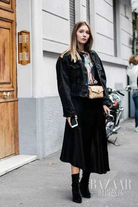 正是深秋时节,短夹克与长裙的组合,再搭配及踝靴也堪称完美哦~