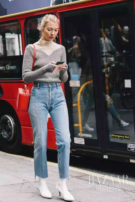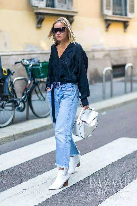 及踝靴搭配铅笔裤已经过时了,现在流行用宽松牛仔裤搭配及踝靴!修身上衣搭配略为宽松的牛仔裤,可以将裤腿遮盖住及踝靴,要得就是80年代的复古风格。