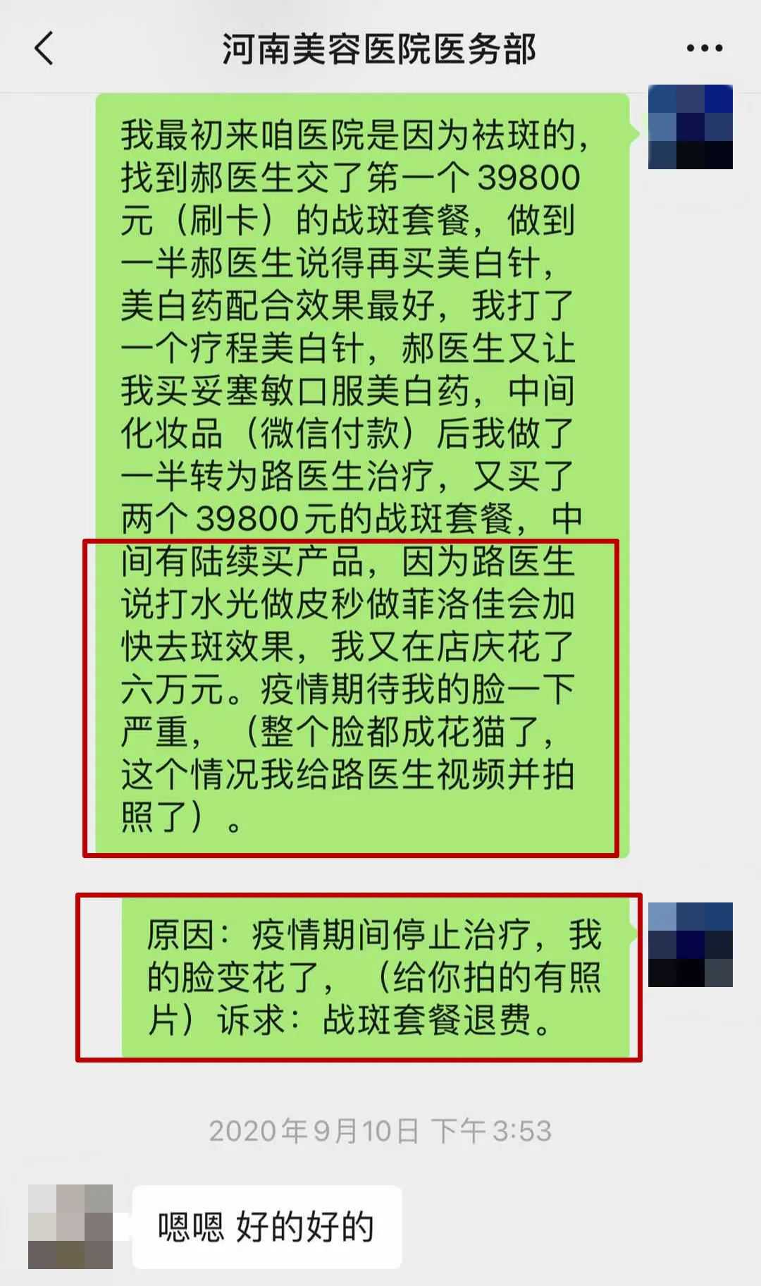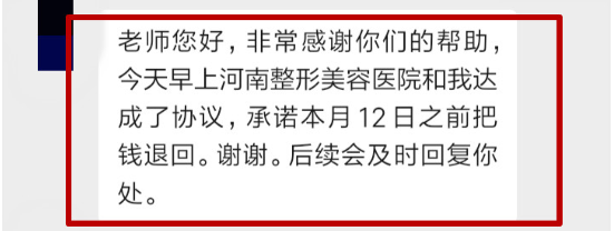 接到投诉,@河南都市爆料记者从9月28号上午11点多添加河南整形美容医院美容师微信好友,联系河南整形美容医院电话,但电话一直处于无人接听状态。10月5日,郑州市的王女士再次@河南都市爆料反映:河南整形美容医院医务部的工作人员已经主动联系她。承诺要退还她两个战斑套餐的费用,除去每个套餐内包含的礼品和活动费用,总计退还64000元整。双方达成协议,在10月12日之前退款到账。王女士表示:对这个结果满意。