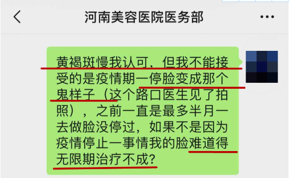 疫情期间,由于医院没有正常营业,她间隔了两三个月没有去。随之发现脸上的黄褐斑越来越严重,面部还出现大面积的青色!她拍照发给了美容师,但美容师也没有给出解决方案。