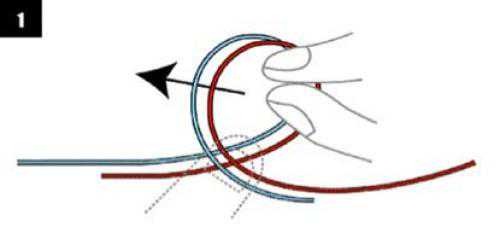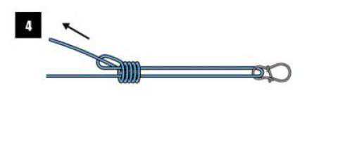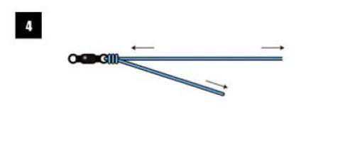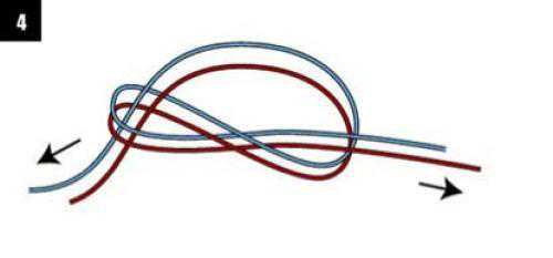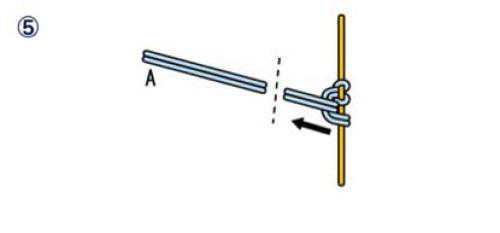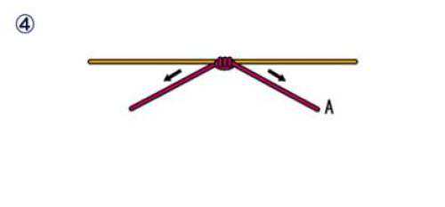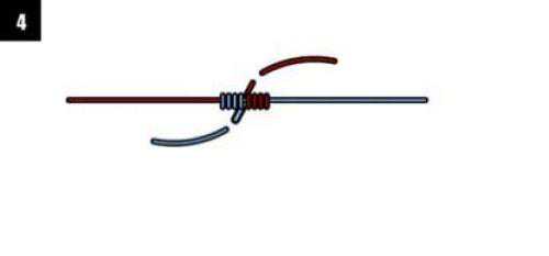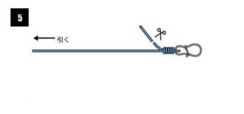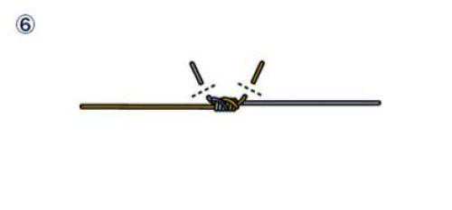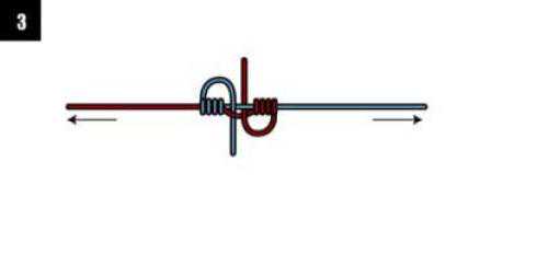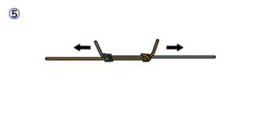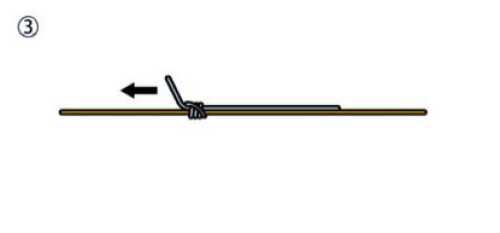 如图4所示方向拉紧线结,使线结靠近环孔。为了能使线强度更好,线可以用唾液沾湿,拉紧使线结更加牢固。最后剪除线端多余部分
