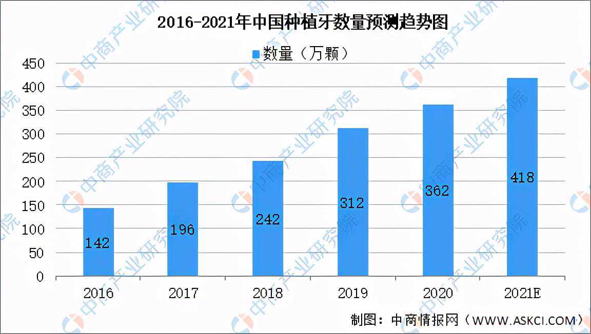 种植牙指的是一种以植入骨组织内的下部结构为基础来支持、固位上部牙修复体的缺牙修复方式。种植牙可以获得与天然牙功能、结构以及美观效果十分相似的修复效果,已经成为越来越多缺牙患者的首选修复方式。数据显示,2016-2019年我国种植牙数量由142万颗增至312万颗,中商产业研究院预测,2021年我国种植牙数量可达418万颗。