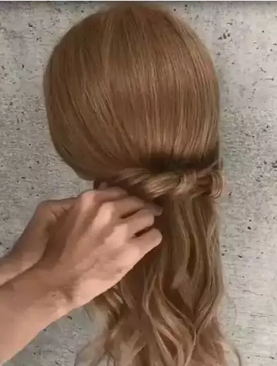 STEP3:交叉过后,先将左边长出来的发尾再向上缠绕一圈。