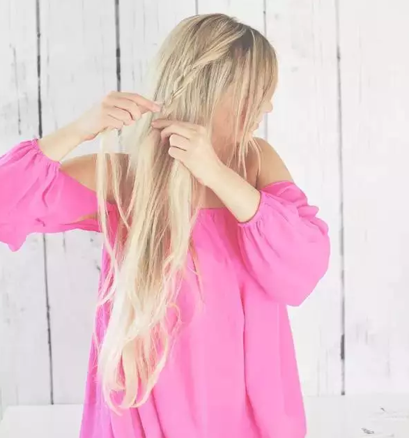 Step1:留出刘海部分的头发,从刘海后方取三小束头发开始编发辫至发尾。