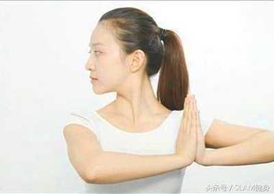 颈部推移法(左右动作要领相同)双手于胸前合十缓缓向右推,同时向左拉伸颈部,复位,重复五次。[注意事项:双手向右头部向左(双手向左时头部向右。)动作轻缓,用力拉伸]
