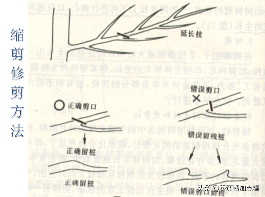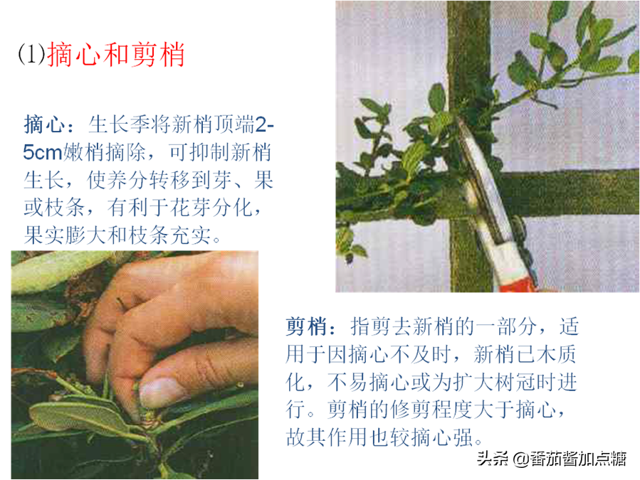 2.疏(疏剪或疏枝):将枝条从分生点基部剪去抹芽、摘叶、去萌、疏花疏果也属于疏。