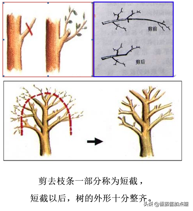 a、调节树木营养生长和生殖生长之间的关系,看是要长树还是要开花挂果。加强营养生长——令其多发长枝(中短截),少发短枝,促发强枝(重短截);加强生殖生长——令其多发中短枝(轻短截),营养积累充足以分化花芽。