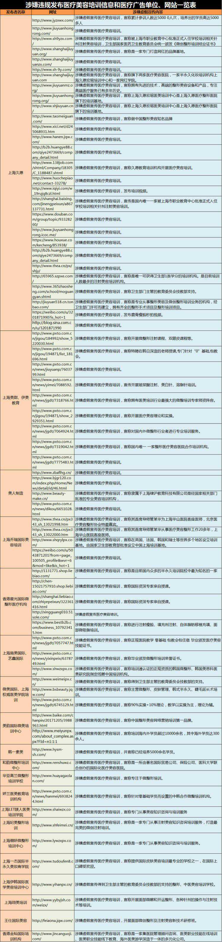 还有部分单位以施美艺鑫国际医疗美容培训机构、韩一素美、王仕国际美容、上海翊美培训、上海权威医美学院培训、上海微美国际微整形、怡美美容培训、伊美教育培训中心、上海LET媄人医美培训学院等名义在金泉网、列表网、培训通、百姓网等多个网站发布医疗美容培训信息。