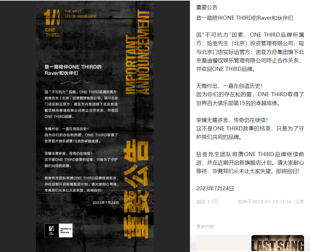 距离北京ONETHIRD宣布收回品牌、重启OT旗舰店时隔不到一个月,目前国内最好的两家电子音乐俱乐部,全球排名15的北京Onethird和全球排名43的佛山格莱美汇,它们的声音都在今年消失,不免令人唏嘘。
