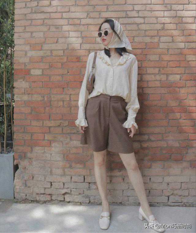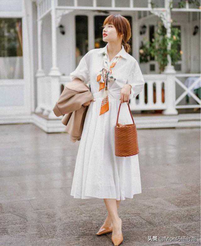 为什么要这样做呢?咱们来看看上面的例子就知道了。白衬衫配高腰伞裙,棕色水桶包和尖头鞋相互呼应,细节但缺乏层次感。搭配丝巾,V型系法不仅可以延长脖颈线条,顺便还添了一丝法式风情。