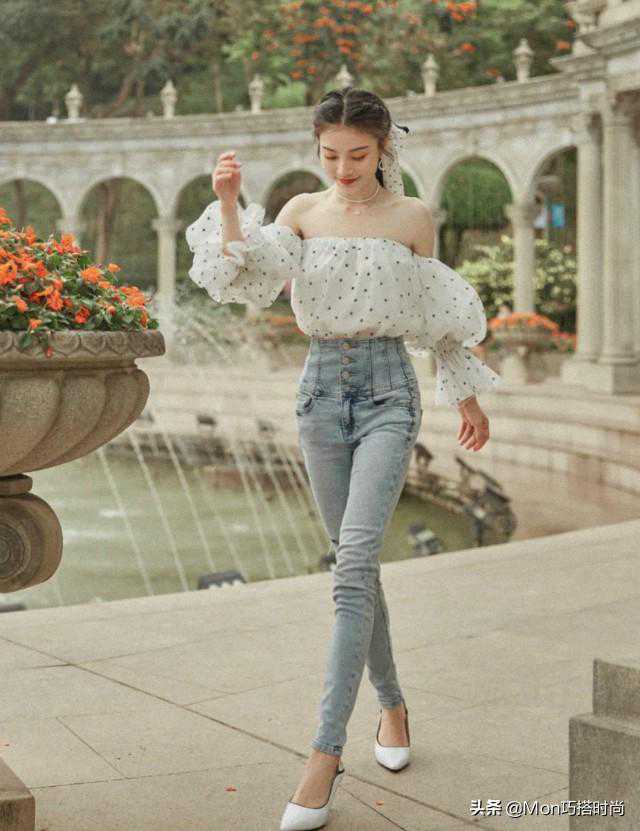 这位小姐姐用黑白波点丝巾在脑后系成了一个精致的蝴蝶结,和波点泡泡袖露肩上衣上下呼应,特别有整体感。再随便配上一条简约牛仔裤,慵懒精致又风情万种。