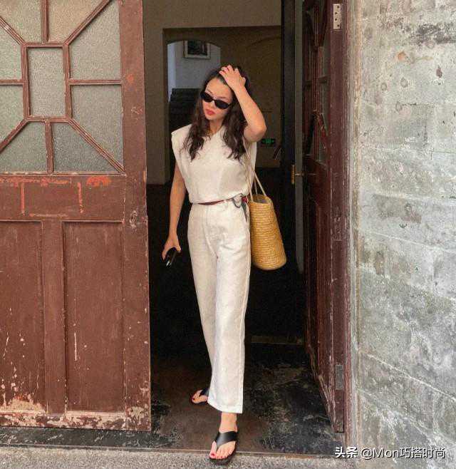 宽松的小飞袖T恤搭配白色微喇裤,配上露趾凉鞋和法式草编包,这可是法式小姐姐们的夏日标准穿搭呢!腰部用彩色丝巾做腰带点缀,是不是一下子就多了设计感?