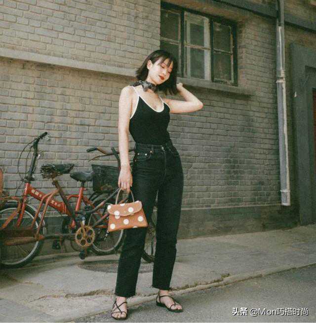 简约的黑白小吊带让配上黑色高腰直筒裤,性感又复古,但胸部裸露面积过大,容易给人一种空落落的乏味感。