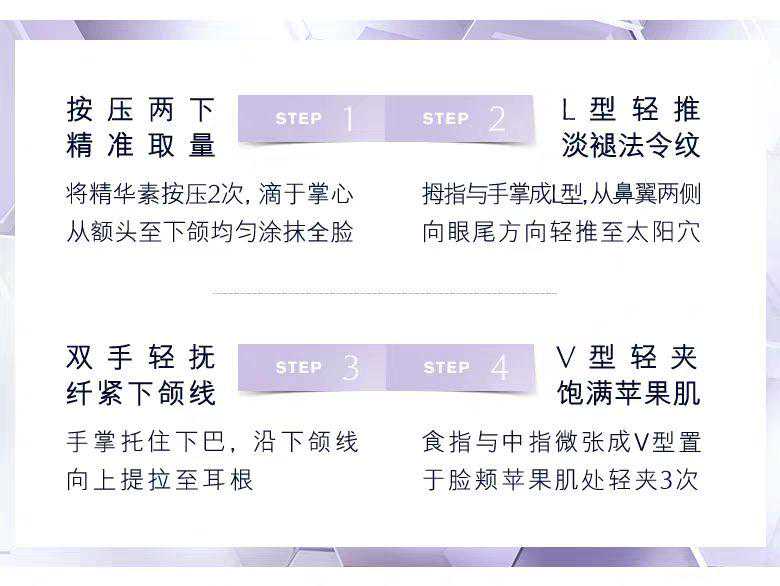 官方宣传这款精华有三大功效:淡褪法令纹、饱满苹果肌、纤紧下颌线。能够淡褪法令纹是因为其中添加了高浓度的乙酰基六肽-8复合物,它能够减缓表情肌收缩,淡褪顽固法令纹。