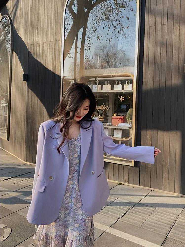 长春花蓝给人一种静谧、优雅、减龄的感觉,应用到西装外套上也别有一番风味,融入西装自带的干练感与严肃性,可以轻松的展现女性的成熟气质与动人妩媚。