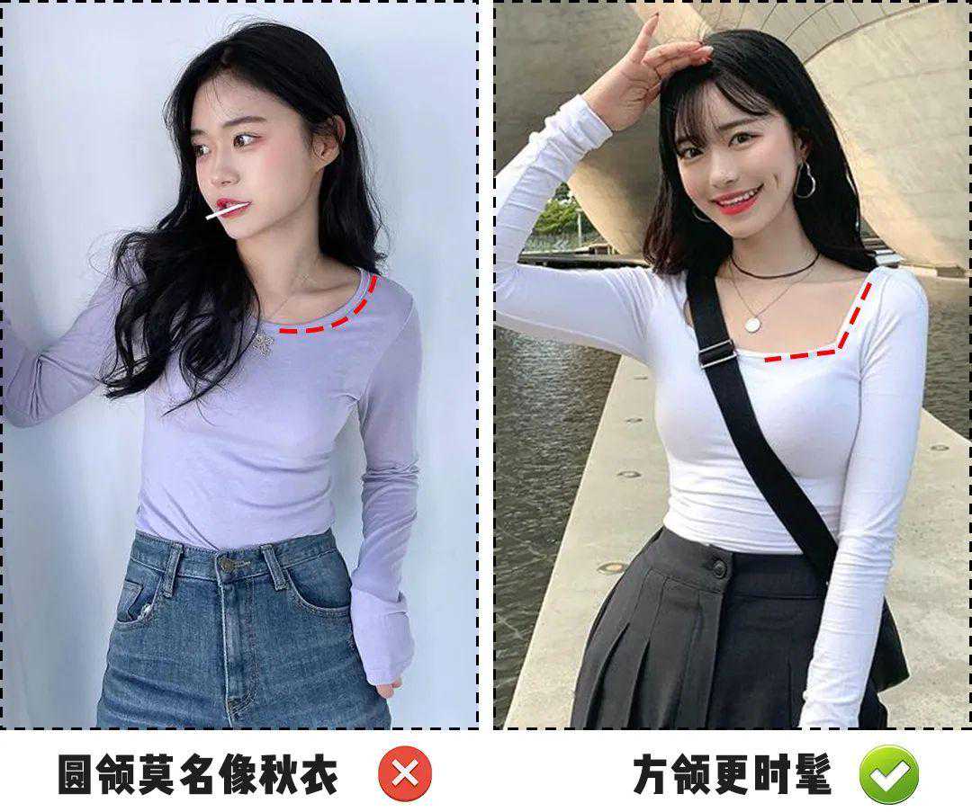 还有V领、方领的上衣,相比过于保守的圆领,这些大领口可以增大露肤面积,显瘦的同时也能修饰颈部线条和脸型,对圆脸、方脸的女生都极为友好。