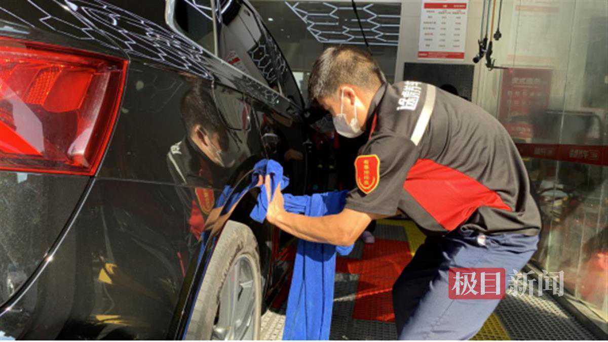 车子发动机声、洗车水枪呲水声、吸尘器声……7月9日,武汉汉南区途虎养车工场店朱家山路店内,洗车的声音一片忙碌,几位洗车师傅埋头苦干,不时用眼神、微笑和手势交流。车辆清洗干净后,他们会打出“OK”手势,有车主竖起大拇指回应,他们的脸上马上浮现出笑容。