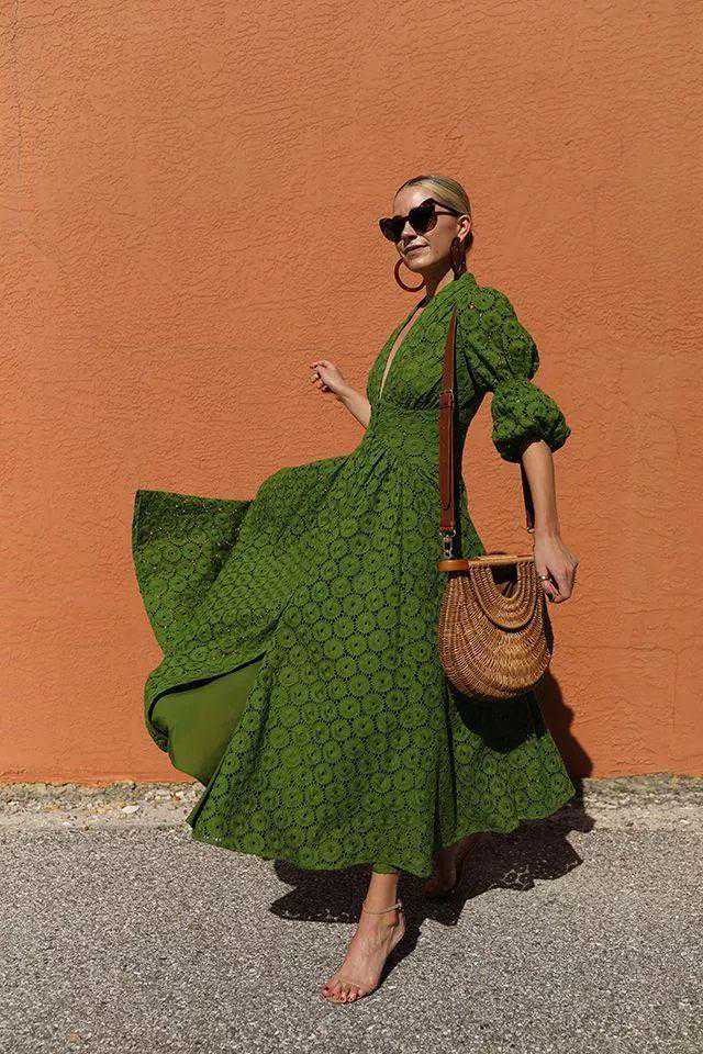 偏深的“黄绿色”就不用说啦,可以衬托地肤色光泽度满分。如果你正好准备去度假,编辑建议你收一条这个颜色的长裙在行李箱里。