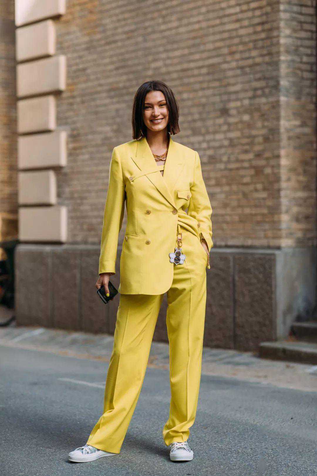 或者,在靠近脸部位置用小面积“柠檬黄”点缀一下,够提亮够显白,但是不会看起来稚嫩。