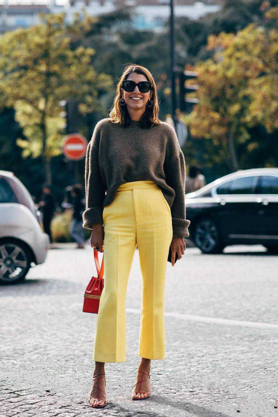 腿够细的报友们可以尝试一下柠檬黄色长裤,因为它的颜色有点浅还有点亮,所以会有一定的膨胀感。