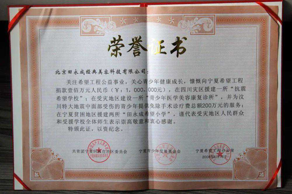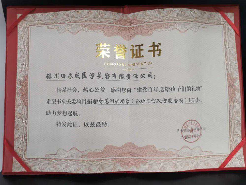 2005年7月8日,中国医师协会美容与整形医师分会、美容与整形修复援助(宁夏)中心在银川田永成医学美容机构成立;2008年,向宁夏青年基金会捐赠100万元援建抗震希望学校;2020年,“致敬最美逆行者·公益行银川市第一人医院站”活动中,为银川市第一人民医院援鄂医护人员捐赠15万元的物资;2020年冬季,由共青团西夏区团委与银川田永成医学美容有限责任公司共同举办的“爱在暖冬·助力成长青春温暖行动”中,向西夏区某小学捐赠一批学习用品;2021年,在由共青团银川市委、共青团永宁县委、闽宁镇人民政府和银川田永成医学美容有限责任公司共同举办的“建党100周年送给孩子们的礼物”活动中,为闽宁镇小学捐赠5万元书桌等学习用品。