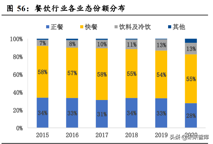 国内餐饮市场整体稳健增长,后疫情时代波折中复苏。2019年我国餐饮市场规模达4.7万亿元,2014-2019年CAGR为10.1%,受疫情影响2020年规模同比下滑15.4%至4.0万亿元,跌幅远超过同期社零总额3.9%的跌幅水平,此后餐饮企业渐进复苏,预计2021年市场规模将恢复至4.7万亿元,且行业将重回健康增长态势,2024年市场规模可增长至6.6万亿元。从分类上来看,根据国家统计局数据,2020年正餐、快餐、饮料及冷饮、其他餐饮业四大类营业额占比分别为27.8%、54.6%、13.1%、4.5%,其中饮料及冷饮服务份额自2015年以来提升最为明显。