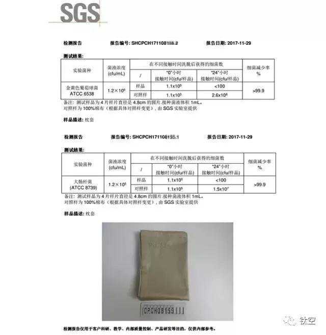 SGS实验室抗菌性测试报告中,BinWan美颜枕套抗菌率可达99.9%