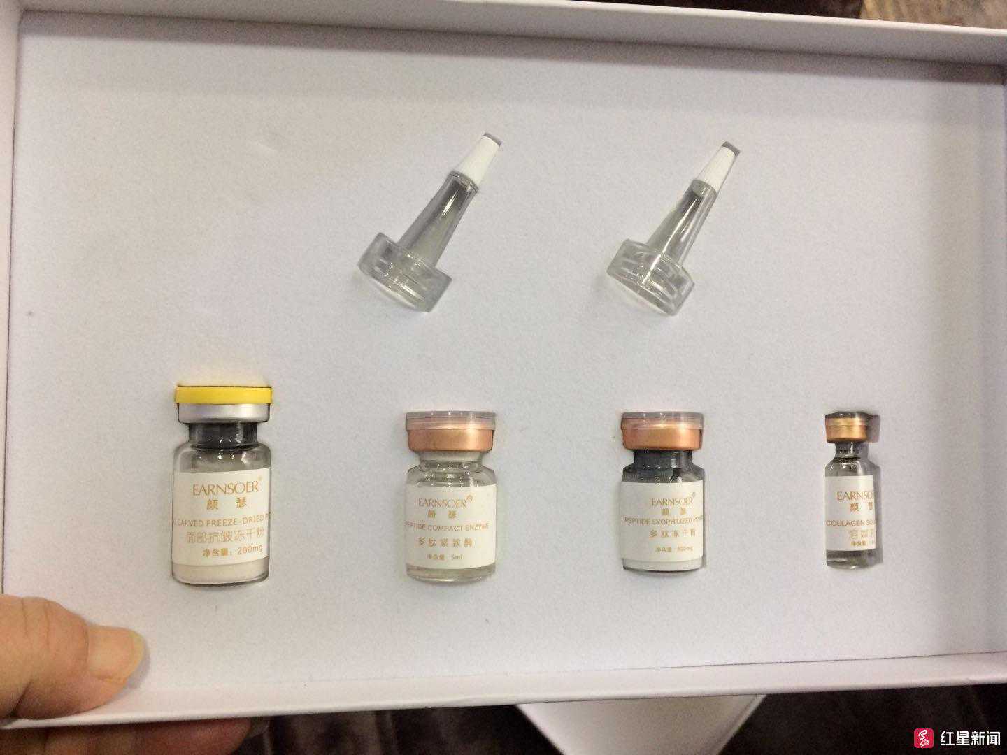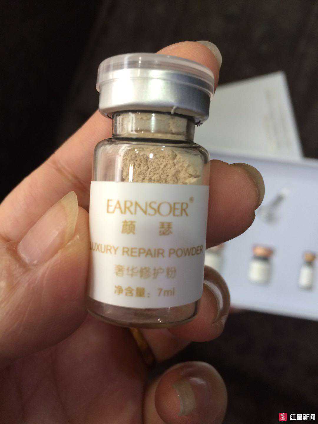 马芳和清姐所用的“颜瑟”面部抗皱套盒,包括“奢华修护粉”“面部抗皱冻干粉”“多肽紧致酶”“多肽冻干粉”等。红星新闻记者以加盟者身份,通过“奢美人”官网联系到了该公司负责招商和技术培训的燕女士。燕女士说自己公司总部在天津、唐山,后来做大了在香港成立“鑫美国际”。但产品是在广州生产的,“有欧盟认证,你绝对可以放心。”燕女士告诉记者,“‘无针微整’是最近几年刚流行起来的,‘奢美人’做得算比较早的,已经有两年。”燕女士称,“无针除皱的产品导入中胚层,连真皮都没达到,不会影响神经和视力。”