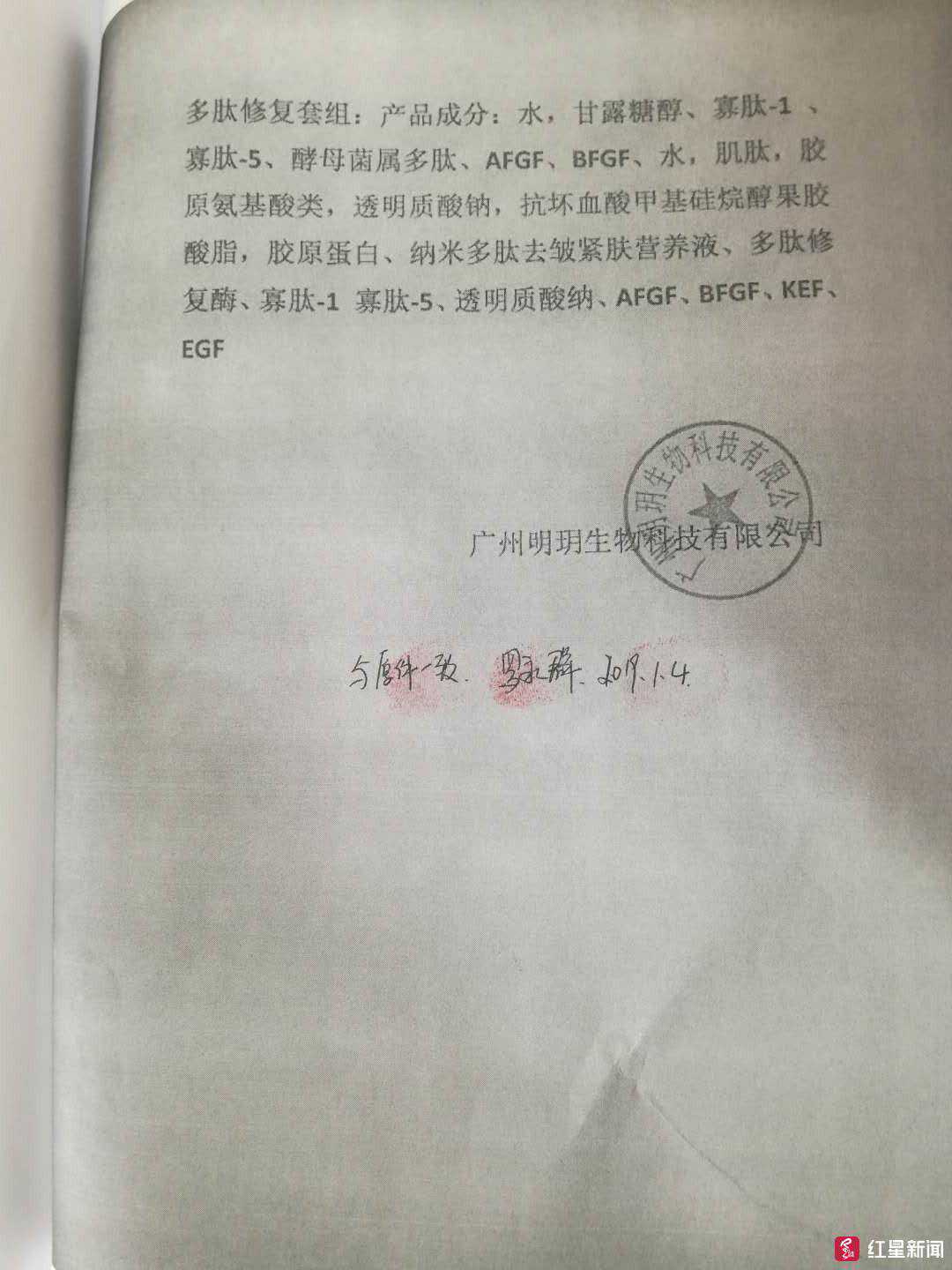 1月9日,红星新闻记者联系到了罗梅的老师张校,张校称他已经没做“香港明玥”了,随后挂断电话。在此前他写给唐刚和王芸的承诺书中,确认两人使用“香港明玥国际的多肽袪邹(皱)后感觉眼睛视力模糊”,承诺对唐刚、王芸负责到底,并自称“香港明玥国际全球代理商”。