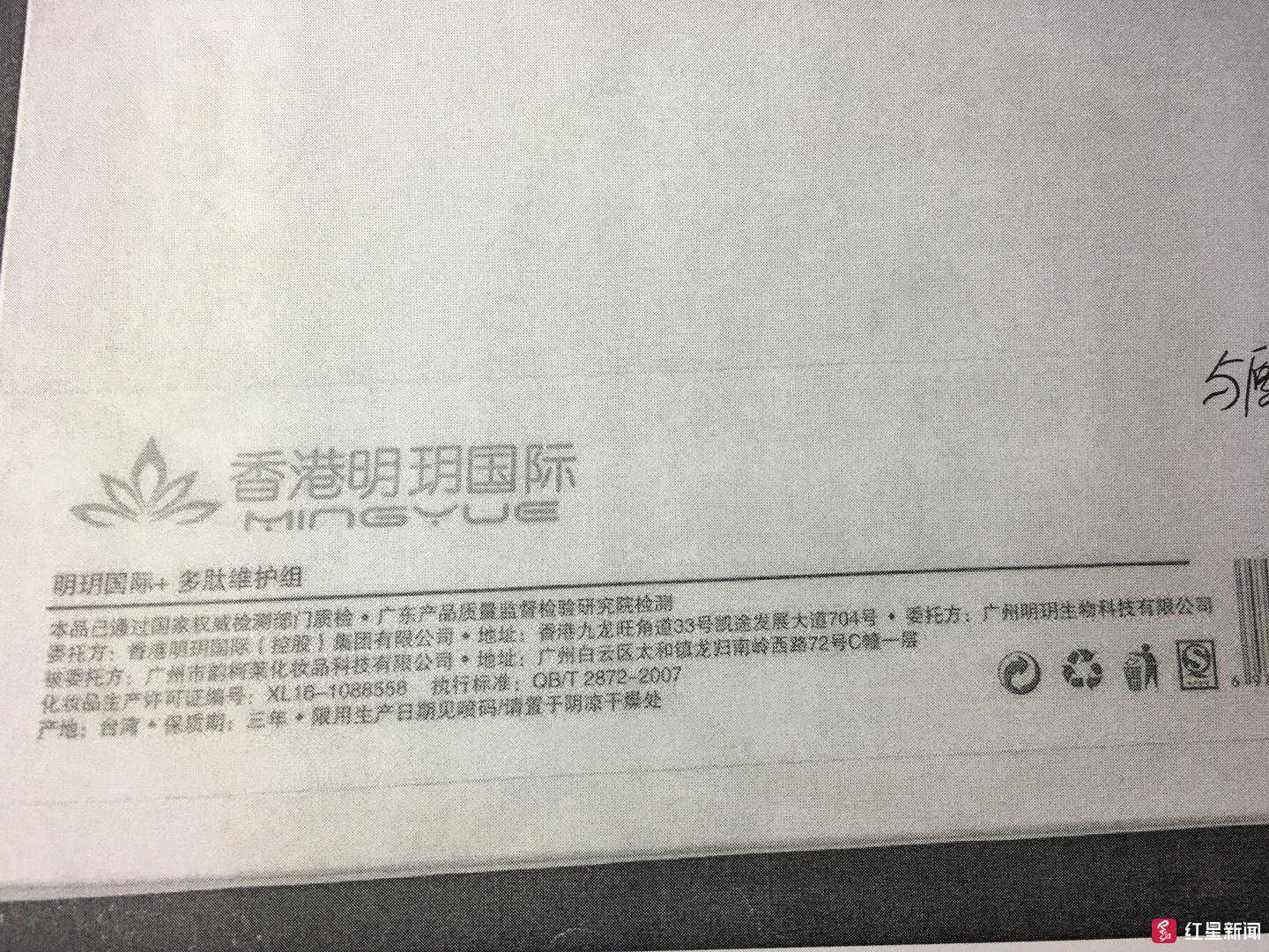在罗梅转交给卫计执法部门的外包装复印件上,有文字描述称:“本品(明玥国际+多肽维护组)已通过国家权威检测部门质检、广东产品质量监督检验研究院检测。委托方:香港明玥国际(控股)集团有限公司(以下简称香港明玥);委托方:广州明玥生物科技有限公司(以下简称广州明玥);被委托方:广州市韵柯莱化妆品科技有限公司(以下简称广州韵柯莱)。化妆品生产许可证编号:XL16-1088558,执行标准为QB/T2872-2007。”1月4日,罗梅又转交了一张广州韵柯莱的《化妆品生产许可证(副本)》复印件。