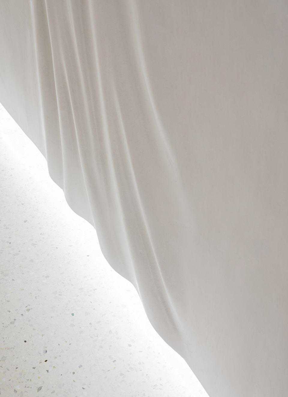 美,来于自信,无需艳丽妆容华美外衣,自内心而发,便会裙摆飞扬。于是将设计定位为素雅空间内体现一种柔美自信的张力。进门处双弧形的设置,增强代入感。弧形玻璃配以点阵图案,在视觉上制造动态。椭圆形前厅内,利用黑色高光软膜营造压迫感的表皮,视为释放前的序曲。