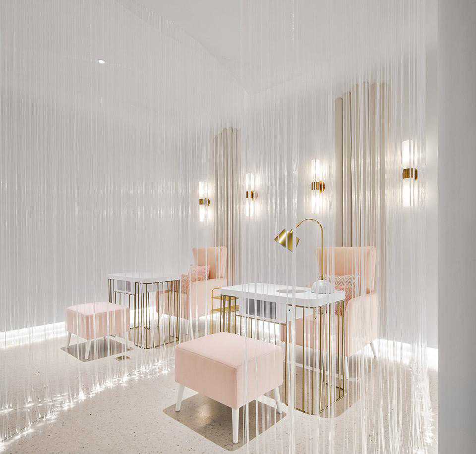 进入主厅,首先展现的是由上百根光纤线构成的美甲区,辅以仪式感的主宾位,将原本枯燥的美甲过程以梦幻的氛围呈现。