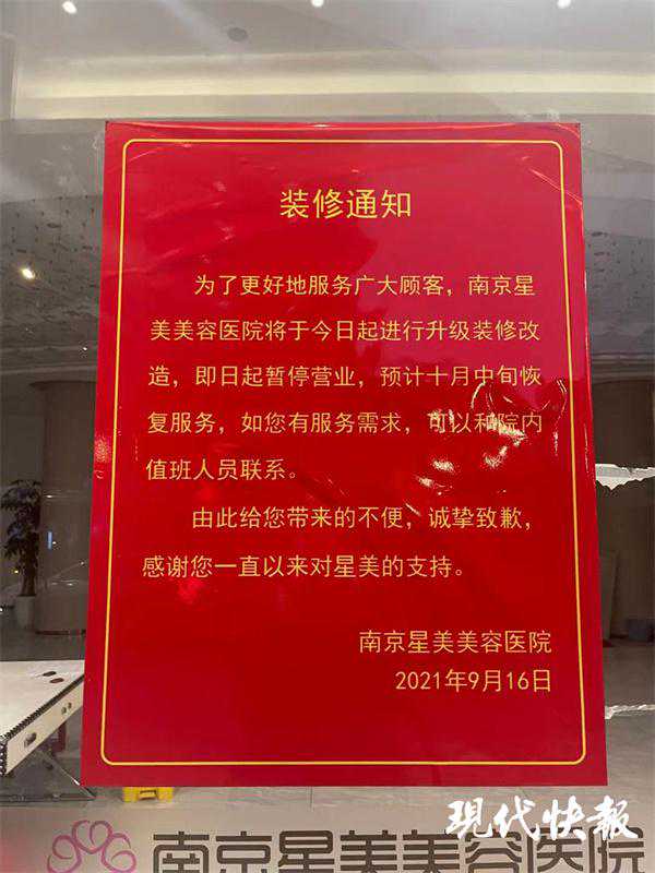 正常服务了几次后,7月中下旬疫情发生,医院暂时去不了。等到9月4日,南京星美美容医院重新开门,9月17日,医院大门紧闭,贴出了一份"装修通知","为了更好地服务广大顾客,南京星美美容医院将于今日起进行升级装修改造,即日起暂停营业,预计十月中旬恢复服务……"