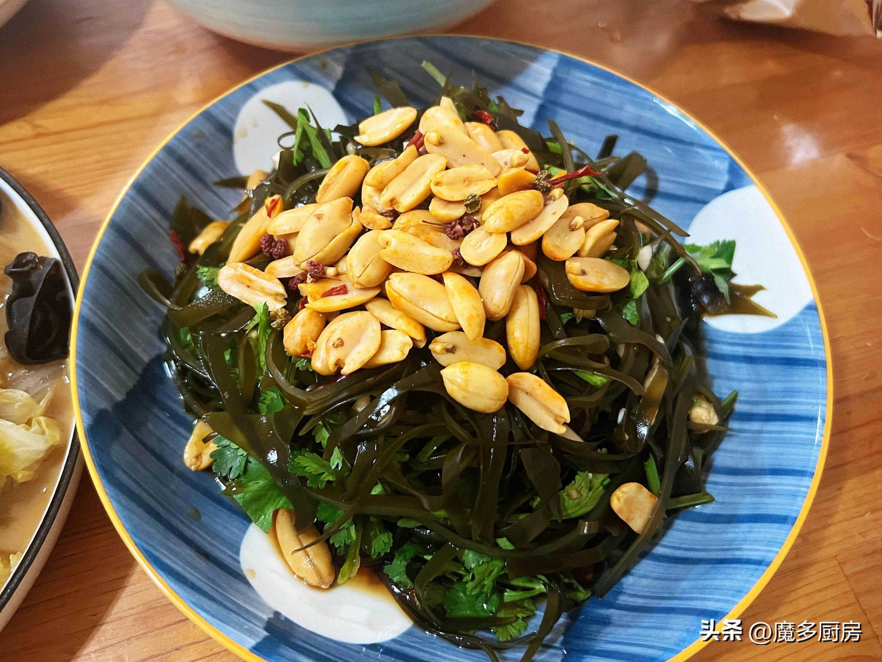 做法:干海带洗净后充分泡发,泡好之后切细丝,放到开水锅里煮3分钟左右,捞出沥水,放到小盆里,大蒜拍扁切碎放进去,香菜洗净后切成小段放进去,加香油、香醋、生抽酱油、盐、白糖,调拌均匀后装盘,再放上麻辣花生米即可上桌。