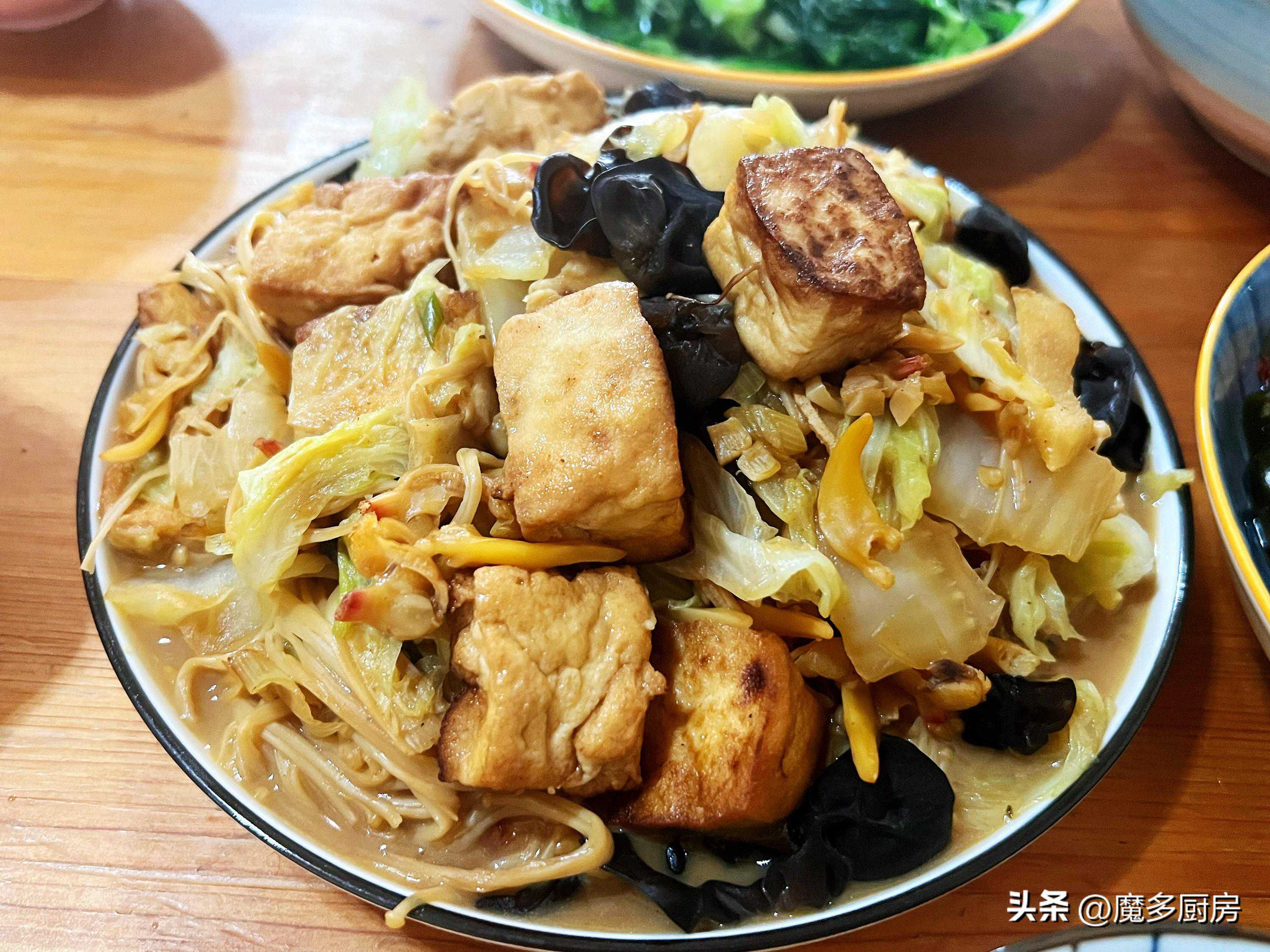 4、放大白菜、金针菇、泡发的木耳、再放上煎过的豆腐块,最后淋上生抽酱油和蚝油,盖上锅盖,炖煮至断生;