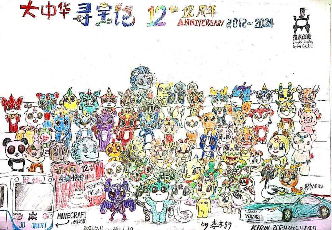 大集合中的神兽们个个栩栩如生,造型可爱生动,充满童趣,真的太厉害了!相信这位小画家一定是我们《大中华寻宝记》的忠实粉丝,作品中集合了整个系列的所有神兽,也记录了这十二年来,每一本寻宝记系列丛书中的珍贵回忆,很感谢这位小画家的良苦用心!希望李宗轩小朋友再接再厉,继续画出优秀的作品,加油哦!——主笔老师