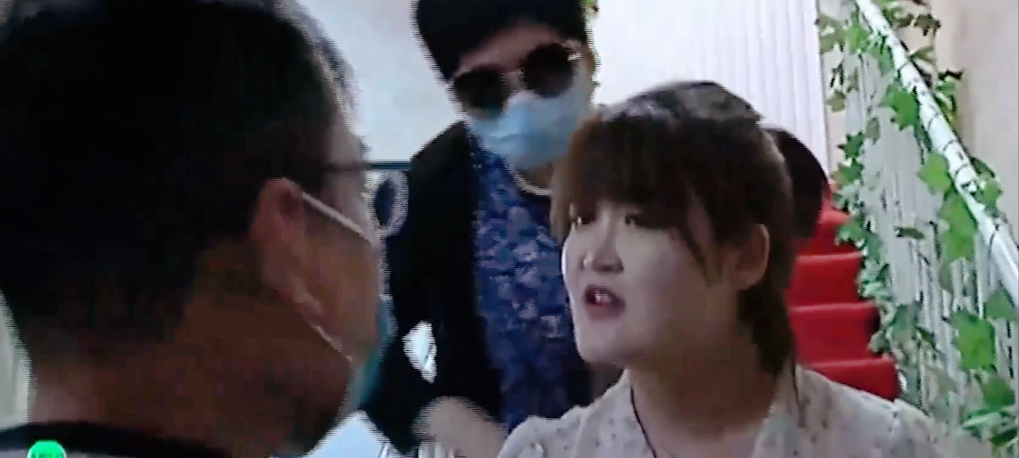 记者和老人以及执法人员都想上去看看楼上的服务员到底是怎么做的,但是前台的工作人员一下子站在楼梯上面,直接挡住了同他们的去路,并且双手抱臂,十分嚣张!