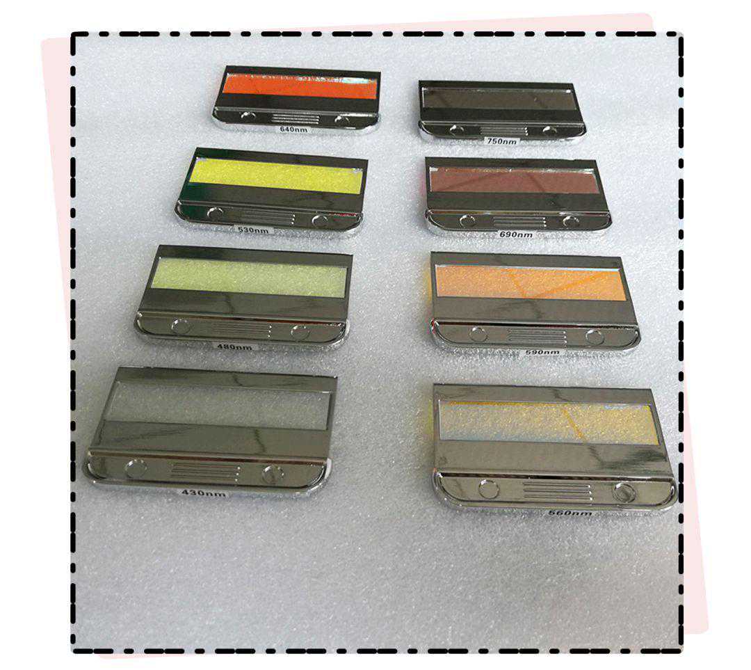 滤波片就是指灯头上的那片彩色的像玻璃一样的东西,它能过滤掉没用的短波长光。上面提到,脉冲光的能量波长至少要达到600nm以上才会有脱毛效果,其实这点我们能从滤波片的颜色看出来。大于600nm波段的光在光谱上呈现红色