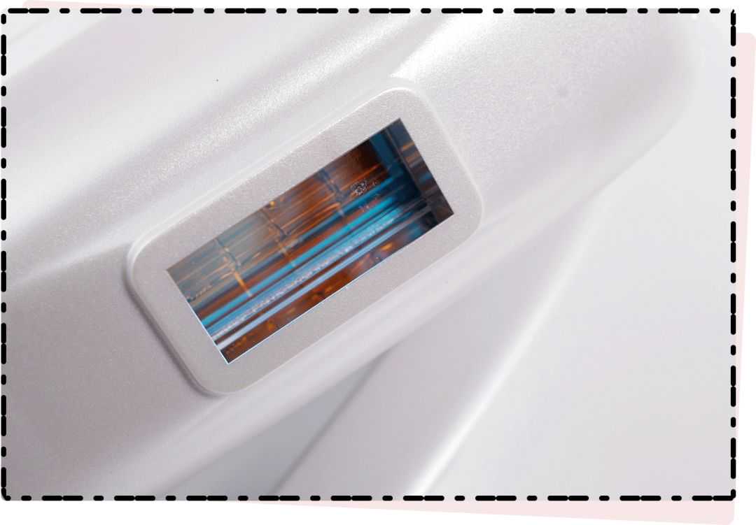 它的出光口灯头和别的脱毛仪都不太一样,看起来蓝蓝橙橙的,这个其实是ULIKE的蓝宝石冷光科技(相当于在家也能做冰点脱毛),当脉冲光打在皮肤上时你不仅感觉不到灼热,反而还会觉得冰冰凉凉的,这就是机身自带的「冰点模式」
