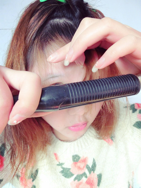 我们夹直板把前面那部分头发夹直,如果本身就是厚刘海的妹子,就可以直接把头发夹直,如果是中分的妹子请看后面我示范打薄刘海的步骤,因为我自己已经是薄刘海,所以好像没办法示范。不过后来我想了个办法,可以让大家怎么剪成薄刘海。我们先来夹直刘海吧。如下图,然后我们把头发分出来,刘海那部分留出来。