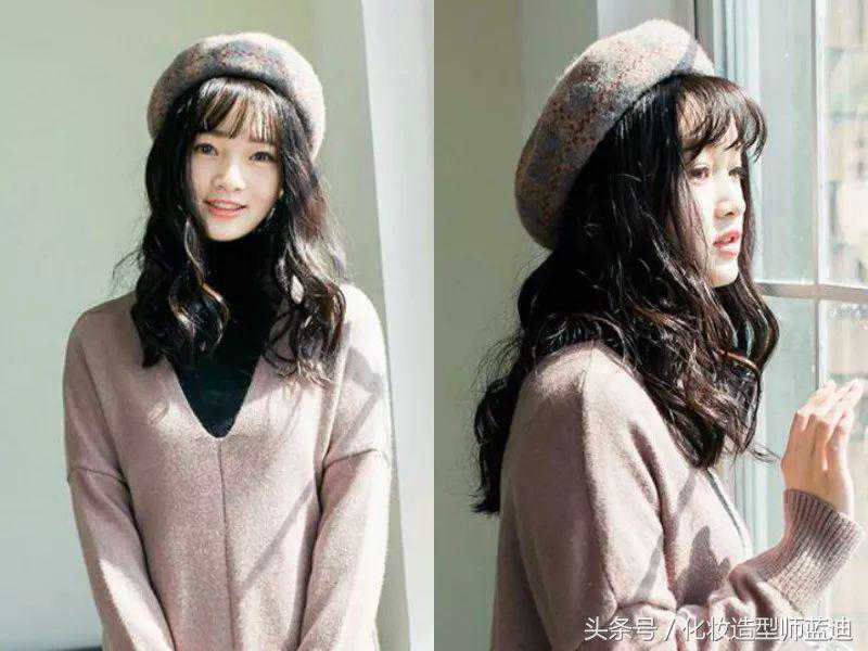 中长发烫起来不要太好看,刘海轻微四六分,露出妹子光洁的额头,看起来清丽透气,中长发经过卷发处理后蜷曲在一起,发质看起来弹性十足,戴上奶茶色的贝雷帽,整个人显得时尚又文静。