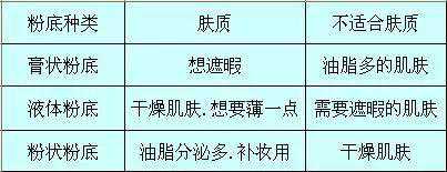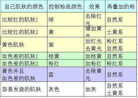 用什么颜色才更适合自己的肌肤呢?亲们可以参考一下下表,对照自己的肤色选择适合的控制粉底。